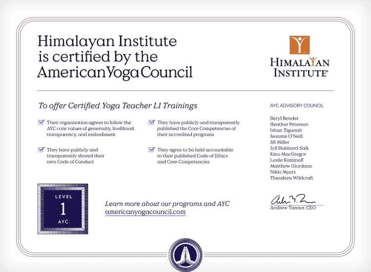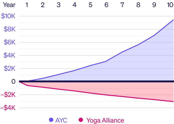 AYC recognizes competency, lineage, and teaching context, not just hours completed. AYC certifies teachers; Yoga Alliance registers them. You also get active business support, not just a registry listing. AYC is your yoga business in a box. See the charts above for more details.
