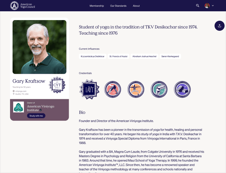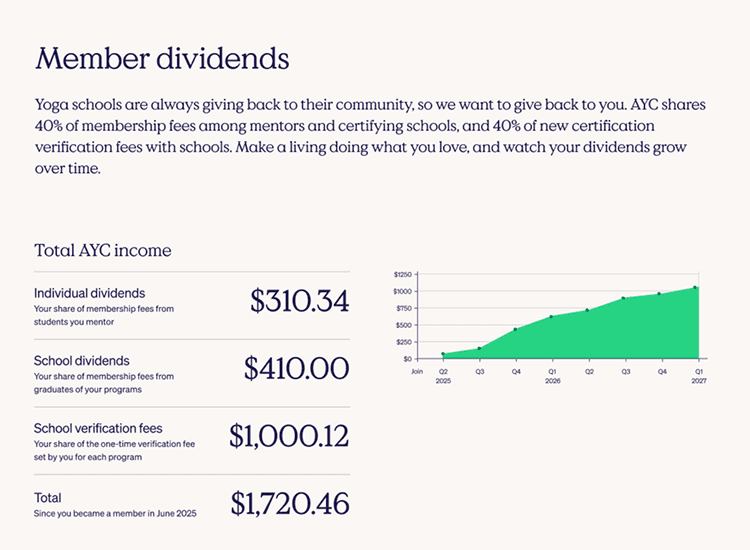 Professional membership includes: 1. School Profile: Share your lineage, events, faculty, and web links 2. Program Accreditation: Receive school accreditation and create training programs and CEs 3. Program Promotion: Feature your school, events, training programs, and CEs on our directory 4. Free Support: Free 1-on-1 onboarding and ongoing tech support over Zoom 5. Revenue Share: Get 40% of graduates’ one-time certification verification fees PLUS recurring revenue share from AYC’s membership pool Plus all the Premium features: 1. Teacher Profile: Share your influences, bio, and web links 2. Directory Inclusion: Be seen on the AYC map and findable in searches 3. Mentor Connection: Follow your mentors and find trainings in your lineage 4. Certified Expertise: Have your yoga history and specialties reviewed and receive an AYC-verified level 5. Event Promotion: Promote your workshops, retreats, and online courses on the directory 6. Business Coaching: Attend monthly clinics with yoga business leaders 7. Member Benefits: Exclusive discounts, free education, and group insurance rates 8. Revenue Share: Accept mentees and earn recurring income from AYC’s membership pool AYC is the membership that pays for itself.