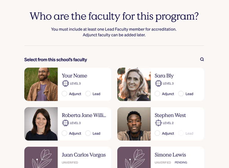 You will sign up at the Professional membership level. Every Professional member has a teacher profile and a school profile; in this case, you'll add your institution name for both. Your main focus will be primarily on building your school profile. This is where you’ll create accredited programs, list additional faculty and promote events.
